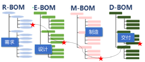 舉個例子,下圖中小紅星代表了我們要找的零件的一個具體信息,它在不同的業務階段可能在不同的“樹杈”上,但這四棵不同的“樹”之間可以通過固定的邏輯進行溯源,因為它們的本質都是產品的分解架構,只是視角不同而已。如此一來,我們要找的目標零件信息就不再是數據海洋中漂流的孤島,而是被X-BOM這棵大樹緊緊串聯在一起,不論漂到哪兒,都能找到自己的“前世今生”。