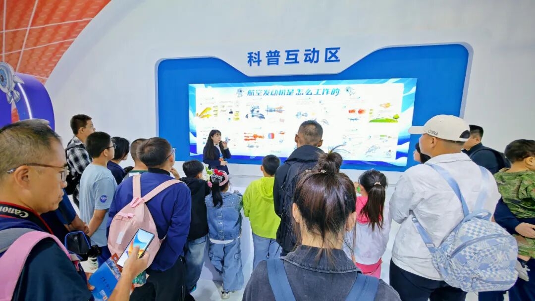 ??展臺現場還專門設置了科普互動區,工作人員通過“講解+互動”的形式,讓青少年了解更多的航空發動機知識,在他們心中播種逐夢藍天的種子。