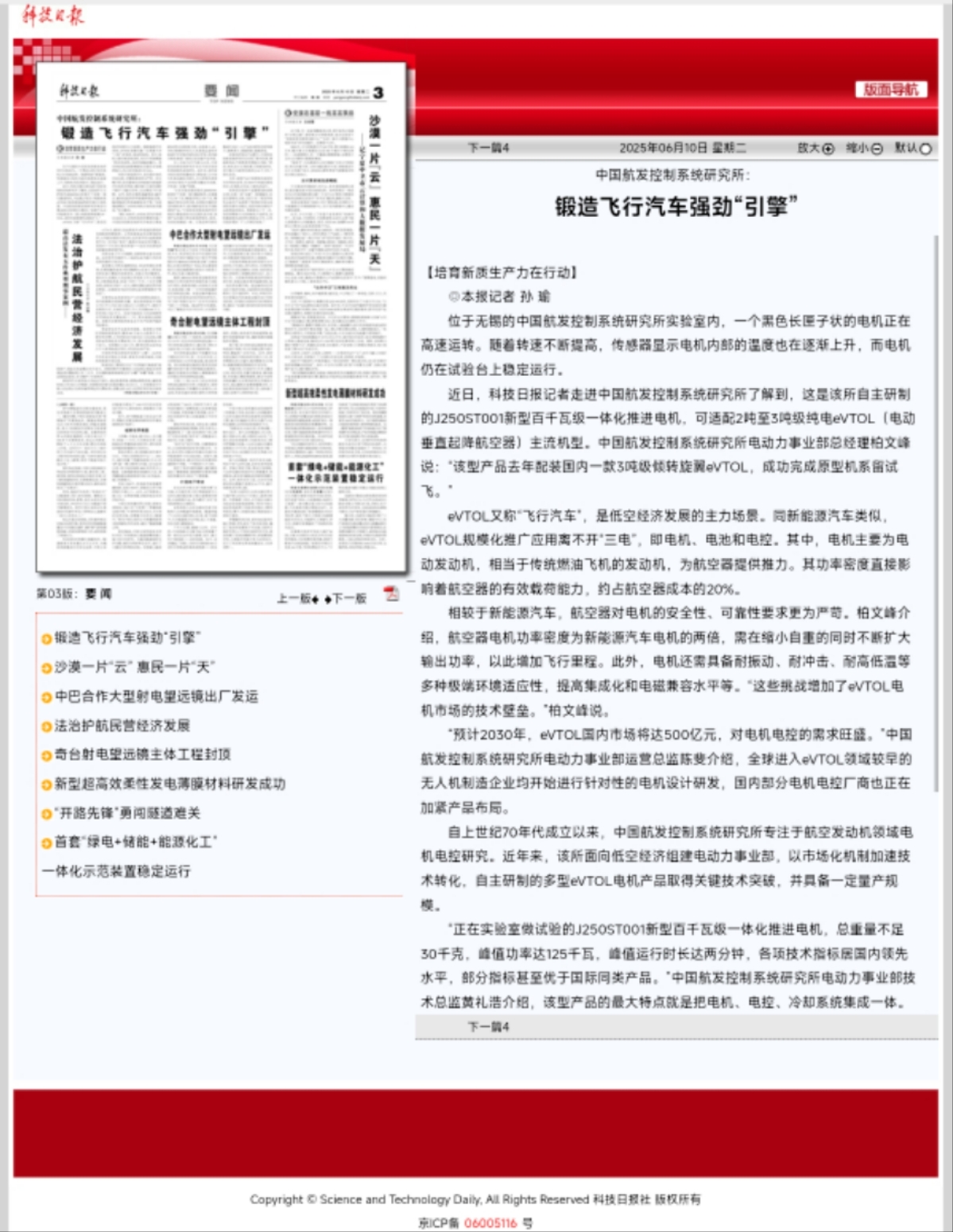 ??低空經濟是產業發展新賽道、經濟增長新引擎,已經連續兩年被寫入政府工作報告。作為低空經濟發展主力場景,電動垂直起降飛行器(eVTOL)規模化推廣離不開動力系統的技術突破。日前,科技日報記者走進中國航發動控所,深入報道了航發人在電機電控領域開展技術攻堅、打造通用航空強勁“中國心”的故事。